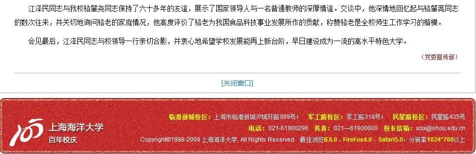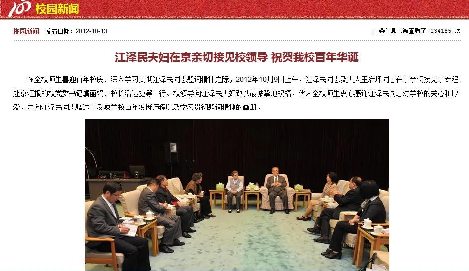 上海海洋大学的网站上党委宣传部执笔文章题为“江泽民夫妇在京亲切接见校领导祝贺我校百年华诞”:“在全校师生喜迎百年校庆、深入学习贯彻江泽民同志题词精神之际,2012年10月9日上午,江泽民同志及夫人王冶坪同志在京亲切接见了专程赴京汇报的校党 委书记虞丽娟、校长潘迎捷等一行。校领导向江泽民夫妇致以最诚挚地祝福,代表全校师生衷心感谢江泽民同志对学校的关心和厚爱,并向江泽民同志赠送了反映学 校百年发展历程以及学习贯彻题词精神的画册。”
