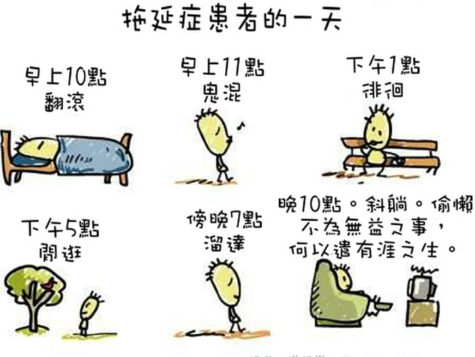 临床表现:能拖到明天去做的事情,就不会在今天完成,正所谓明日复明日,明日何其多!既然这么多,不如再拖拖。