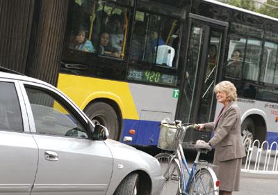 一辆机动车驶入非机动车道(这种行为在北京乃至全国很普遍),一个骑自行车的外国女士见状用车挡住了它的去路,微笑着请司机驶回机动车道。