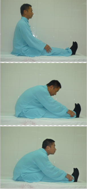 5.双手攀足固肾腰,双手抱脚后跟,下巴尽量向脚靠,约15次。