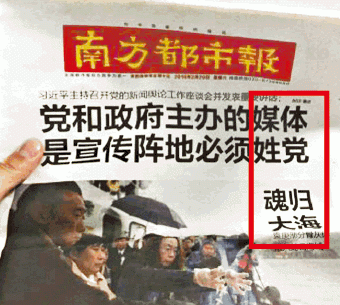 习*近*平视察央媒、强调媒体「必须姓党」后,昨日全国报纸都以此为头版。广东《南方都市报》深圳版竟敢不登习的照片,更在大标题下加「魂归大海」四个大字,造「媒体姓党魂归大海」的藏头诗,疑似不服从。