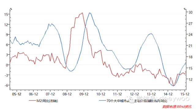 那么,从债务周期的角度来看,从债务周期的角度来看,目前房地产处在什么样的位置呢?根据彭博社的数据,去年中国经济用于支付利息的支出为7.6万亿元,而同期中国的社会融资规模为15.41万亿元。这意味着中国去年的社会融资总量中有近一半是用来维持庞氏融资的。债务融资分为三种:对冲、投机、庞式。对冲融资,其收入可以支付本息。投机融资,短期内收入只能偿还利息而不能偿还本金,必须债务展期。庞式融资,收入连利息也还不上,债务不断叠加,必须再融资或变卖资产/抵押物。经济体中的投机融资和庞氏融资比重越大,杠杆化的现象就越严重,就越有可能爆发债务危机。由是观之,中国经济已是名副其实的庞氏融资红海。由于庞氏融资的信贷规模呈利滚利的指数增长,因此中国的广义货币(M2)只有实现指数增长,才能满足整个宏观庞氏融资对货币流动性的需求,否则就只有爆发系统性的债务违约。可怕的是,根据LPPL模型,中国的M2同比增速要到20%以上,M2才能实现指数级增长,以投机融资和庞氏融资为主的社会融资活动才不至于发生系统性的债务违约。但目前M2同比增速在13%附近已盘整了7个月,没有完成向上突破。M2同比增速目前主要是靠接近历史高位的货币乘数维持。货币乘数已离见顶不远,可能再次坍塌。货币乘数主要靠金融体系的高杠杆维持,一旦坍塌,M2同比增速也将坍塌(把中国的M2数据导入LPPL模型进行运算,中国的M2同比增速在今年8月份左右将再次坍塌,这意味着中国的房地产周期和债务周期今年下半年将出现超级大拐点。),这将导致房地产价格同比增速坍塌甚至是趋负(如图一所示,中国房地产价格同比增速与M2同比增速高度正相关),以房地产为抵押品或投资标的的融资活动开始出现系统性的债务违约。如定义般的,房地产崩盘出现了。