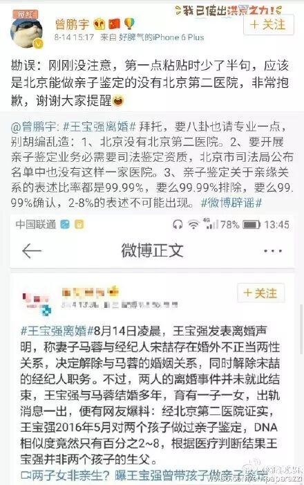 离婚事件曝出后,有消息称经北京第二医院证实,#王宝强#曾对两个孩子做过亲子鉴定,DNA的相似度只有2%-8%。随后网友曾鹏宇辟谣:北京能做亲子鉴定医院里没有北京第二医院,而且亲子鉴定关于亲缘关系的表述比率都是99.99%。