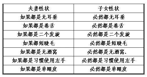 若某家庭成员的上述七对性状中任意一对或几对性状的遗传情况符合上表必然性规律,其他性状因父母不都为隐性性状,无法对照上表进行判断,我们认为该亲子关系可能成立。