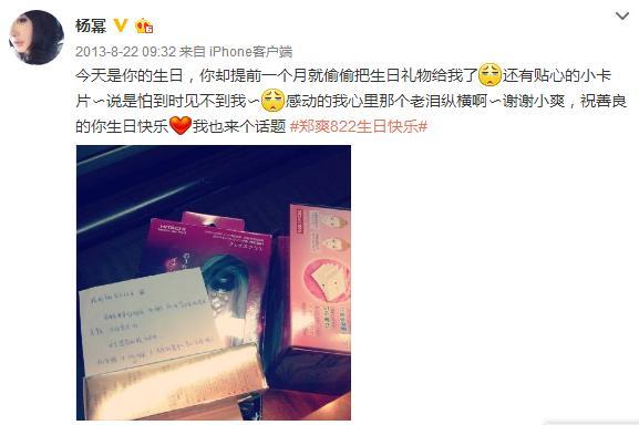 跟杨幂合作的时候,杨幂就在微博上送上微博,祝福爽妹子生日快乐。并且表示爽妹子很贴心很细心。