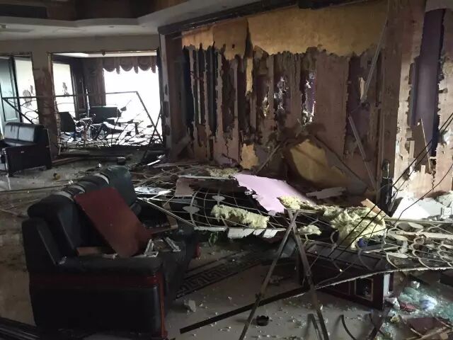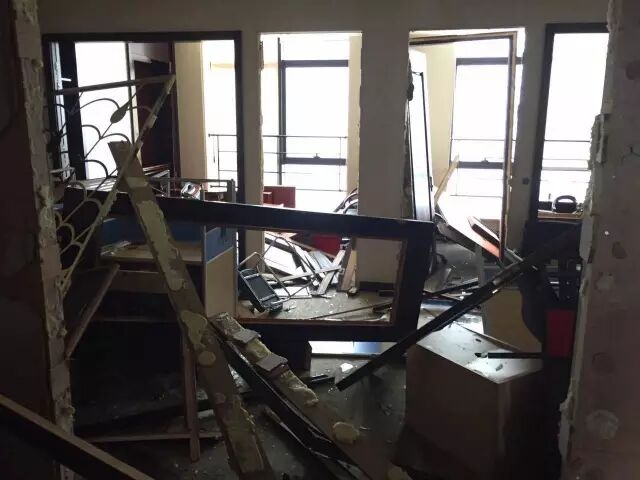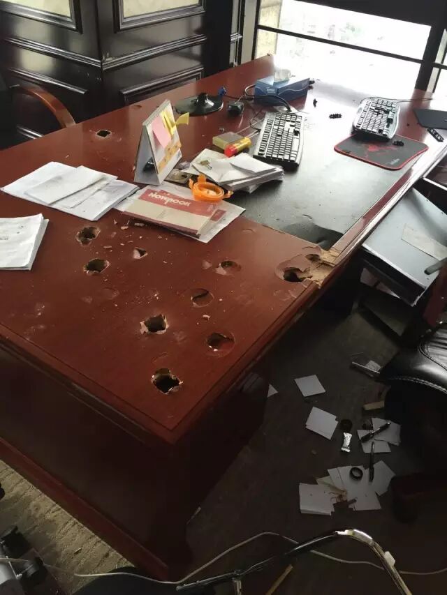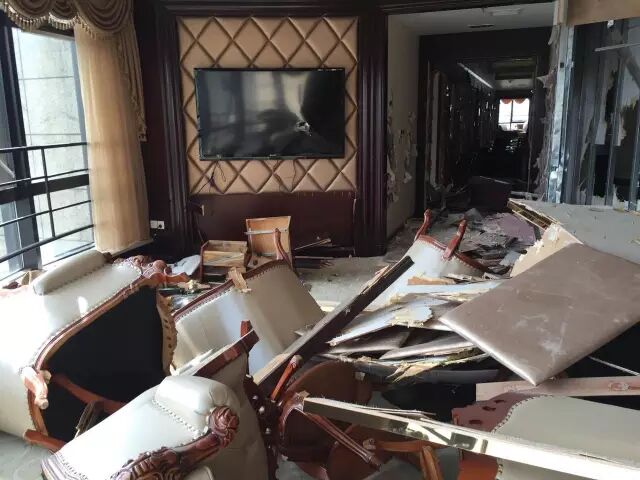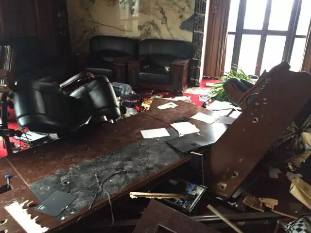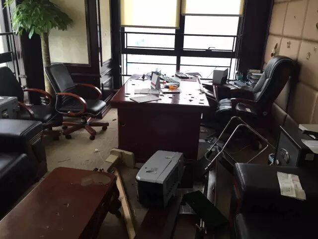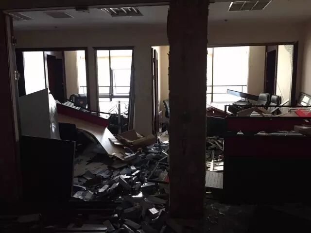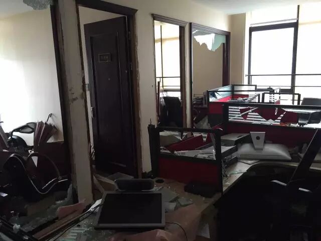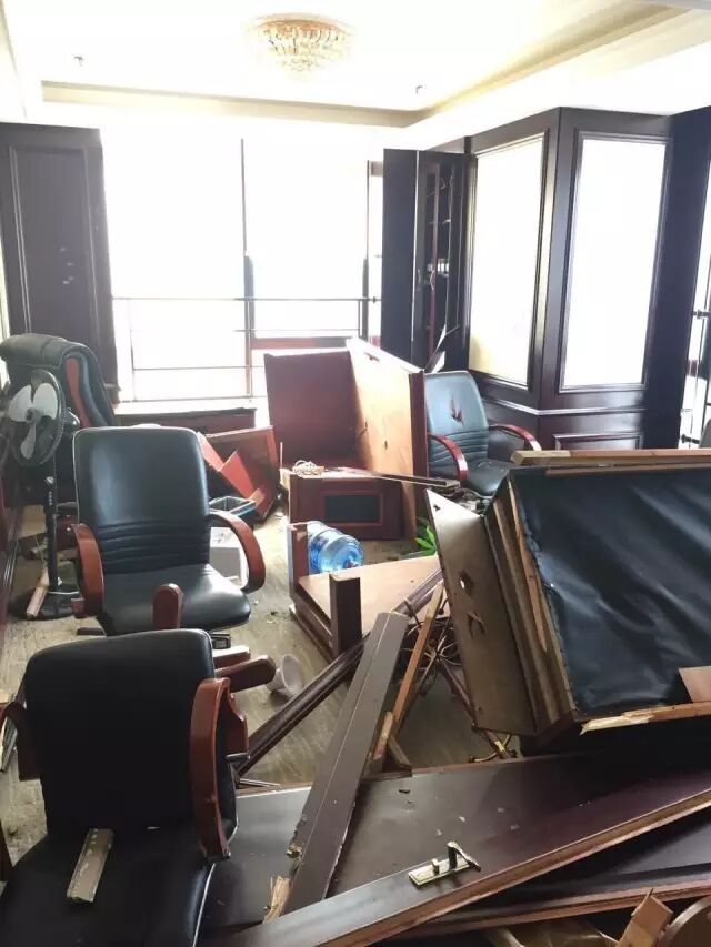 可是,城门失火,殃及池鱼。2016年9月17日凌晨四点二十分左右,伦达金融大厦发生了极为严重的打砸抢事件。事情起因是三盛宏业上市公司旗下的颐圣投资与伦达金融公司存在债务纠纷,与我们完全无关。我们作为伦达金融大厦20楼、21楼的承租方和实际使用方,无故遭受100多号人的打砸抢偷严重暴力事件。公司内所有物资、固定资产(电脑、投影仪、多台超大电视机、办公家具)、现金、名贵字画以及装饰物品全部被犯罪分子破坏,现场一片狼藉,据租住在这两层楼的企业汇总,物资总价值约为2000万左右(具体数字还在统计中)。另外大量员工个人物品被盗抢。同时,我司5名值班同事被不法分子殴打致身体受到伤害和被非法拘禁三个多小时,手机被砸。上述行为严重造成公司财物巨大损失,导致我司所有员工无法正常上班。在G20峰会刚结束十多天,既然在如此繁华的地段发生如此的恶性事件,令人震惊。这是现场照片: