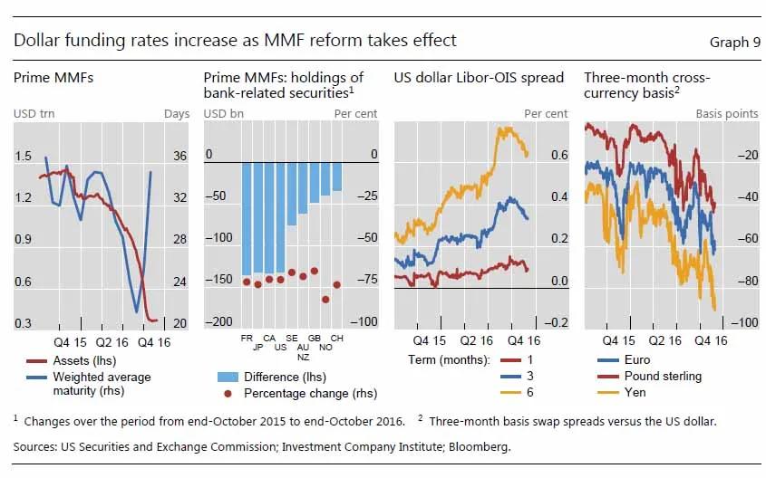 新的美国货币市场规则已经在10月份生效,这导致美元借贷成本以及货币市场利差快速走高,货币市场基金提供的短期美元资金收缩了大约70%。
