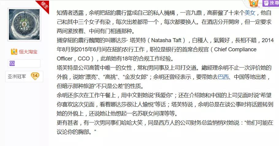 纽约州金融监管机构也表示,是接到纽约农行内部举报,经调查核实后做出该决定的。举报者是原纽约农行一位外籍美女高管,她因抗拒纽约农行总经理余明的性骚扰,先遭冷待,后被除名,她不服,忿而举报。