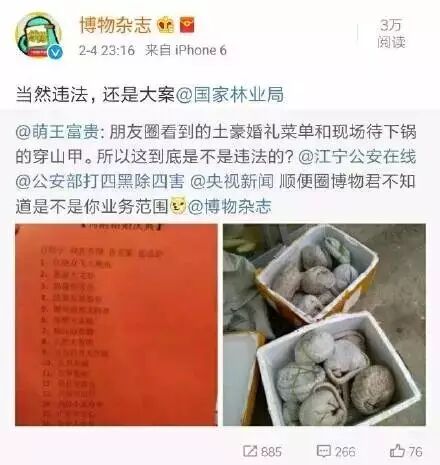 2月4日,一位网友曝光土豪的婚礼菜单,现场还没下锅的穿山甲们想必有“人为刀俎我为鱼肉”的感觉。粉丝众多的“博物杂志”等大V将此事挂起来“示众”,并*了国家林业局官博。