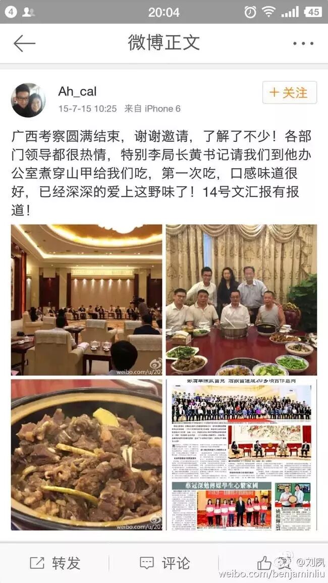 当然,“Ah_ca”的一条微博引起了关注——“广西考察圆满结束,谢谢邀请,了解了不少!各部门领导都很热情,特别李局长黄书记请我们到他办公室煮穿山甲给我们吃,第一次吃,口感味道很好,已经深深的(地)爱上这野味了!”