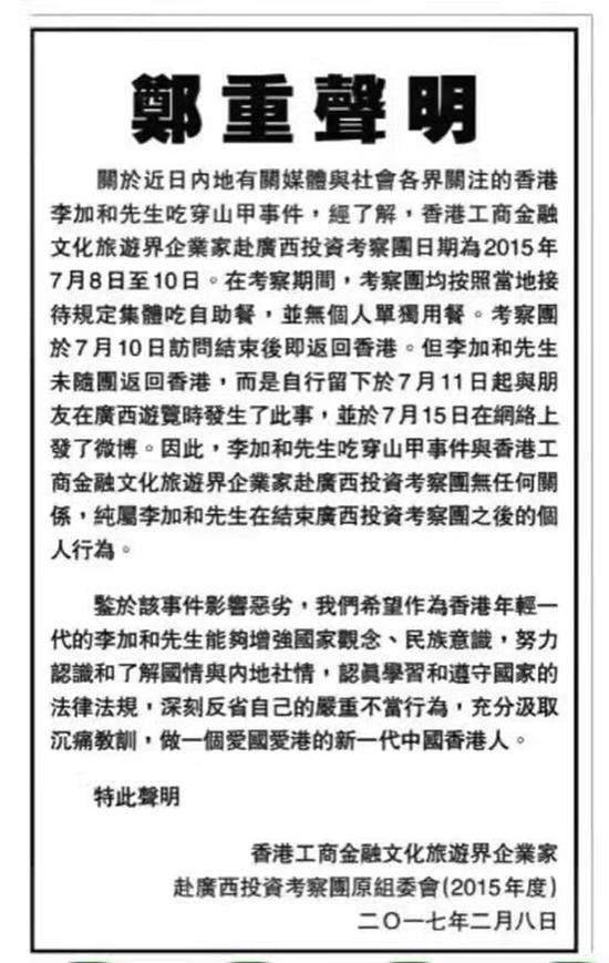 2月8日,“Ah_ca”参与的那个考察团也出来发声明。“香港工商金融文化旅游界企业家赴广西投资考察团原组委会(2015年度)”在当日香港《文汇报》A10版发表声明称,当时考察团按照规定“集体吃自助餐,并无个人单独用餐”,访问结束就返回香港。