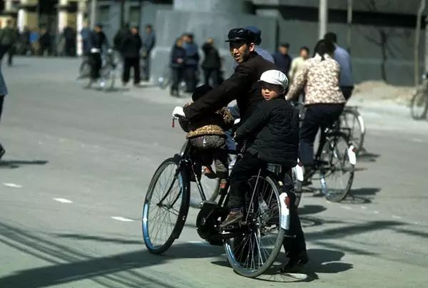 1972年,唐山,大街上骑自车的父子三人。威廉·约瑟夫/摄。