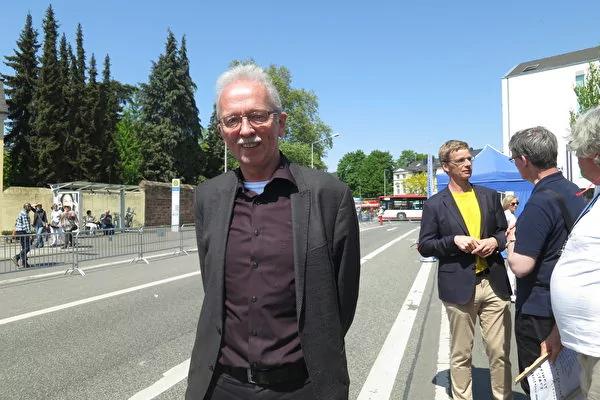 来自汉诺威的人权活动家鲍沃斯菲德(Alexander Bauersfeld)对大..;记者说,“这个雕像是侵犯人权的象征,是侵犯人权的支票。我是为声援中国的人权而来此进行抗议。再过一个月就是六四天安门血案29周年的日子了,当年的那些党领导现在还是中共的领导,这就已经说明这个雕像的意义了。这个雕像对中国意义不同,中国人会误以为,马克思在德国也受到崇拜,这是错误的。”
