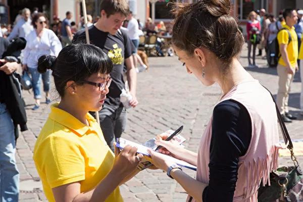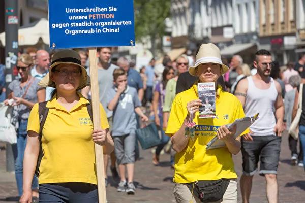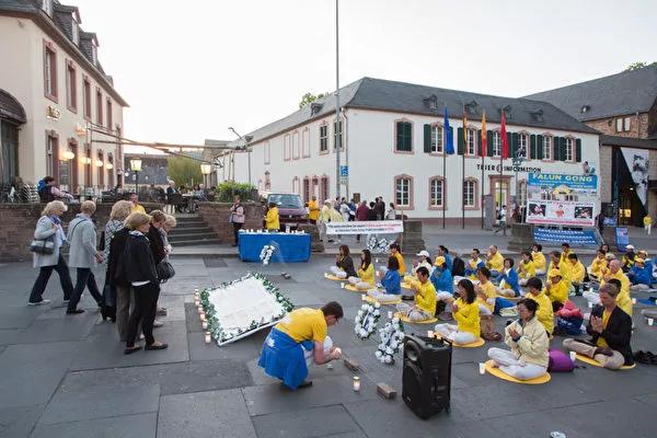 5月5日,来自周边的法轮功学员在德国特里尔市不同地点举行活动,提醒公众关注中共对法轮功的迫害,尤其是活体摘除法轮功学员器官的罪恶。(Matthias Kehrein/大..;