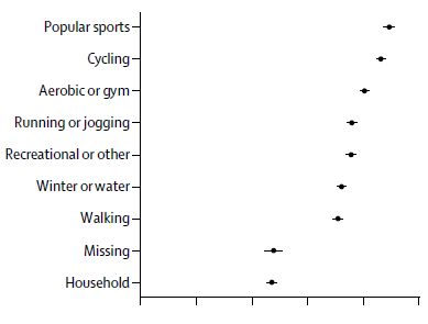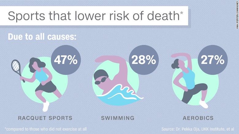 结果如上图所示,第一名是挥拍运动,包含网球、羽毛球,其实也包括在《柳叶刀》研究的第一大类中。它的降低全因死亡率水平最猛,达到47%的下降,直接甩开第二、第三名一大截。第二名是游泳,第三名是有氧运动。