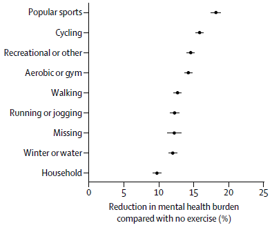 这里解释一下,Recreational sports虽然翻译成娱乐运动,但其实也是一种团队体育锻炼,基本上指的是低强度只是为了玩的篮球足球活动(不需要计分的那种)。从这点上看倒是能解释它为什么能排到有氧体操前面,因为集体活动本身对抑郁障碍的治疗有帮助。