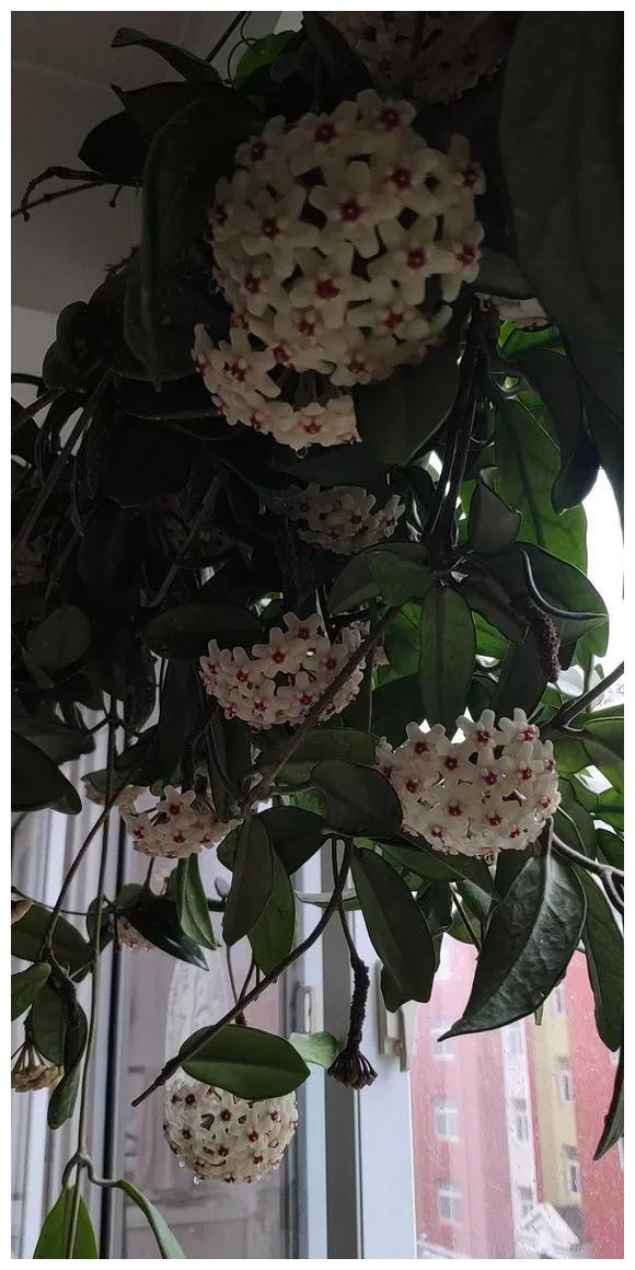 球兰的花就像一个花球,造型别致,富有趣味。花开的时候,香味迷人(有些品种的花儿不好闻),家里养一盆,还可以改善环境异味。球兰对日照要求不高,半阴的环境就可以生长良好,放在北面阳台,也能够开花多,开花旺。