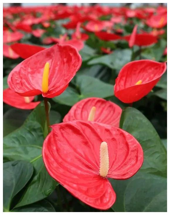 红掌叶子浓绿光亮,花儿红艳艳非常喜庆,红绿搭配十分吸引人的眼球。红掌花期很长,花开后,能够持续好几个月不谢,而且有很好的寓意,象征着生活顺利,事业红火!