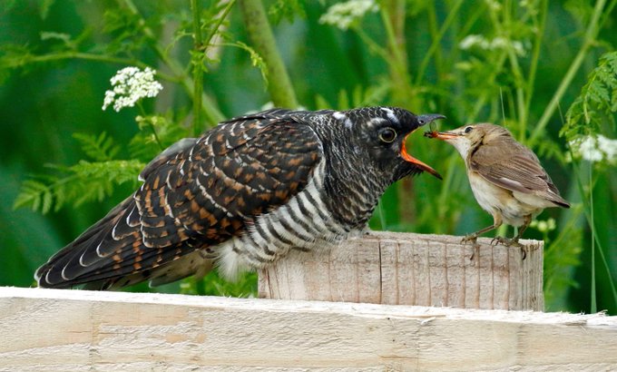根据外媒报导,一名64岁的英国摄影师麦可(Michael Ebdy)就在近日捕捉到了杜鹃鸟「鸠占鹊巢」的画面,从照片上可以看见,一只体型较小的芦苇莺( Reed Warbler)嘴里叼着食物,而一旁则有一只体型比它大一倍的大杜鹃(Cuckoo,又名布谷鸟)宝宝正张大嘴巴嗷嗷待哺,随后芦苇莺便将食物喂给了这只「养子」。