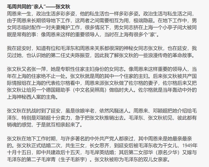 司马璐:张文秋在地下工作时期,与许多著名的中外共产党人都亲过,其中周是她最亲最亲的。张正式结婚二次,共生三女,长女思齐,到延安后被毛泽东收为干女儿,49年十月十五日,即中共建政后十五天,与毛岸英结婚;其后第二女邵华又嫁与毛的第二子毛岸青(生子毛新宇)。张文秋被称为毛的双儿女亲家