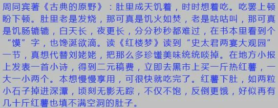 周同宾著《古典的原野》:肚里成天饥着,时时想着吃。吃罢上顿盼下顿。肚里老是发烧,那可真是饥火如焚,老是咕咕叫,那可真是饥肠辘辘,白天长,夜更长,分分秒秒都难过,在书本里看到个“馍”字,也馋涎欲滴,读《红楼梦》读到“史太君两宴大观园”一节,真想替刘姥姥,把那么多珍馐美味统统啖掉