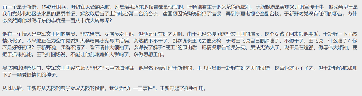共识网:于新野有一个对像是空中文工团的演员,非常漂亮,女演员爱上他,他也爱上了女演员,但他是有妇之夫,由于毛经常接见这些文工团的演员,出问题了,女孩子回来跟他哭诉,从此以后,于新野一百八十度大转弯,从无限的尊敬毛变成无限的憎恨毛,“九一三事件”里,他起了关键作用