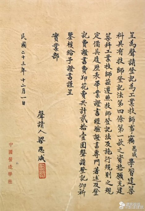 赵逵建筑:梁思成申请建筑科工业技师资格的手稿,大师也是从技师做起的......这手字是真的漂亮
