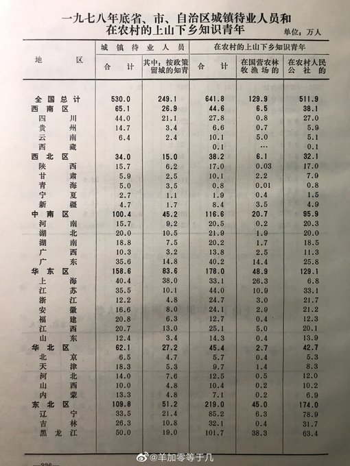 羊加零等于几:【历史数据38】1978年底省、市、自治区城镇待业人员和在农村的上山下乡知识青年