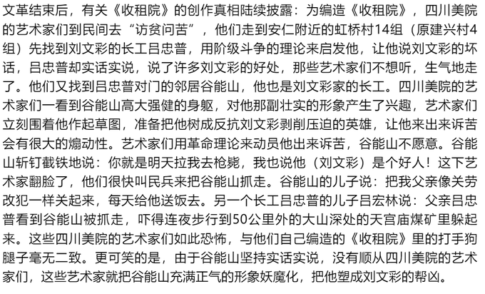 《收租院》是中国美术的耻辱经典有关《收租院》的创作真相陆续披露:为编造《收租院》,四川美院的艺术家们到民间去“访贫问苦”,他们走到安仁附近的虹桥村14组(原建兴村4组)先找到刘文彩的长工吕忠普,用阶级斗争的理论来启发他,让他说刘文彩的坏话,吕忠普却实话实说,说了许多刘文彩的好处