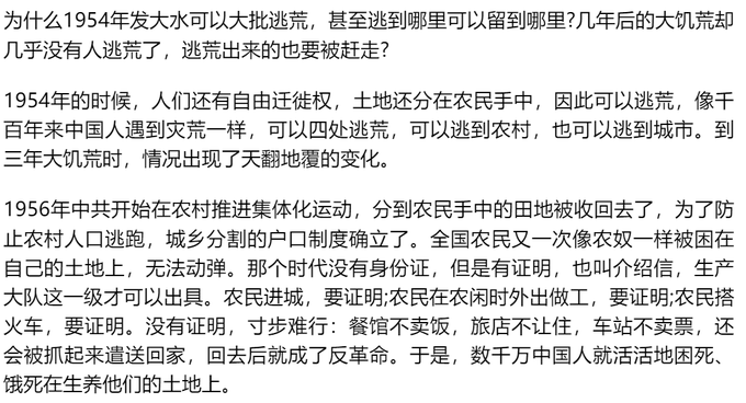 为什么1954年发大水可以大批逃荒:甚至逃到哪里可以留到哪里?几年后的大饥荒却几乎没有人逃荒了,逃荒出来的也要被赶走?1954年的时候,人们还有自由迁徙权,土地还分在农民手中,因此可以逃荒,像千百年来中国人遇到灾荒一样,可以四处逃荒,可以逃到农村,也可以逃到城市
