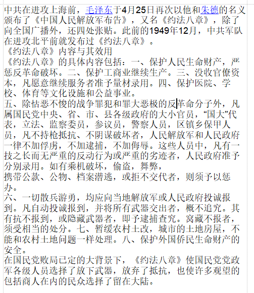 有多少人上了《约法八章》的当:相信中共《约法八章》中的承诺的国民党将领、士兵以及企业家、普通民众,显然是上了个大当,换来的是中共对他们的杀戮、侮辱、迫害,而这正是由中共嗜杀的本性决定的,诸多被披露的历史一再告诉我们,千万不要相信中共的任何承诺,因为其撒谎成性,其历史就是一部谎言史