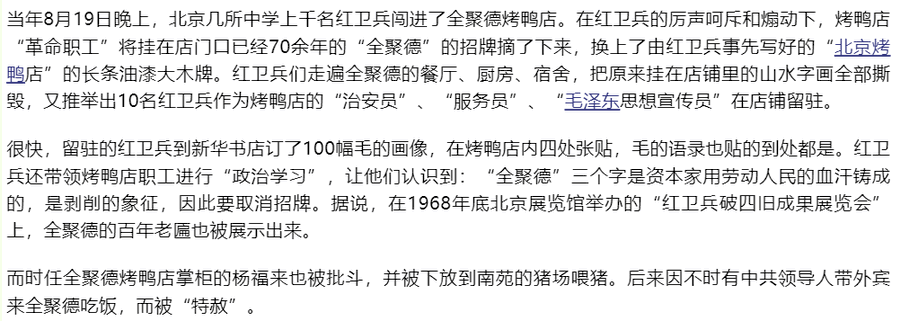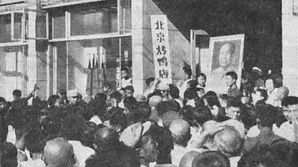 当年八月十九日晚上,北京几所中学上千名红卫兵闯进了全聚德烤鸭店。在红卫兵的厉声呵斥和煽动下,烤鸭店“革命职工”将挂在店门口已经七十余年的“全聚德”的招牌摘了下来,换上了由红卫兵事先写好的“北京烤鸭店”的长条油漆大木牌,红卫兵们走遍全聚德的餐厅、厨房、宿舍,把原来挂在店铺里的山水字画全部撕毁