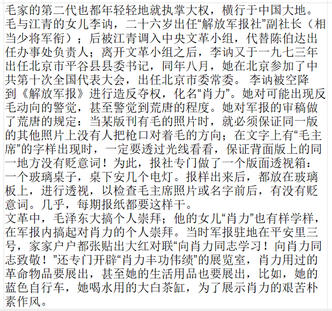 朱韵和:毛家的第二代也都年轻轻就执掌大权,横行于中国大地,毛与江青的女儿李讷,二十六岁出任“解放军报社”副社长(相当少将军衔);后被江青调入中央文革小组,代替陈伯达出任办事处负责人;离开文革小组之后,李讷又于一九七三年出任北京市平谷县县委书记,同年八月,她在北京参加了中共第十次全国代表