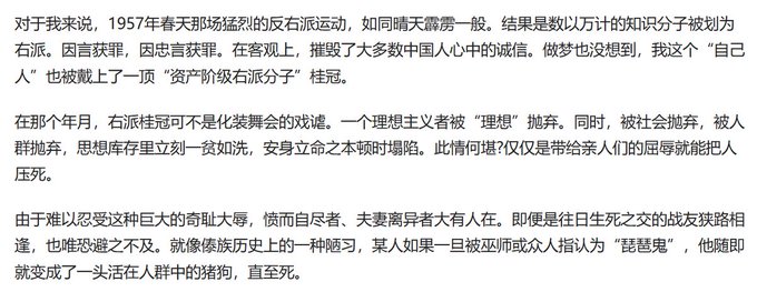 白桦:在那个年月,右派桂冠可不是化装舞会的戏谑。一个理想主义者被“理想”抛弃。同时,被社会抛弃,被人群抛弃,思想库存里立刻一贫如洗,安身立命之本顿时塌陷。此情何堪?仅仅是带给亲人们的屈辱就能把人压死。由于难以忍受这种巨大的奇耻大辱,愤而自尽者、夫妻离异者大有人在