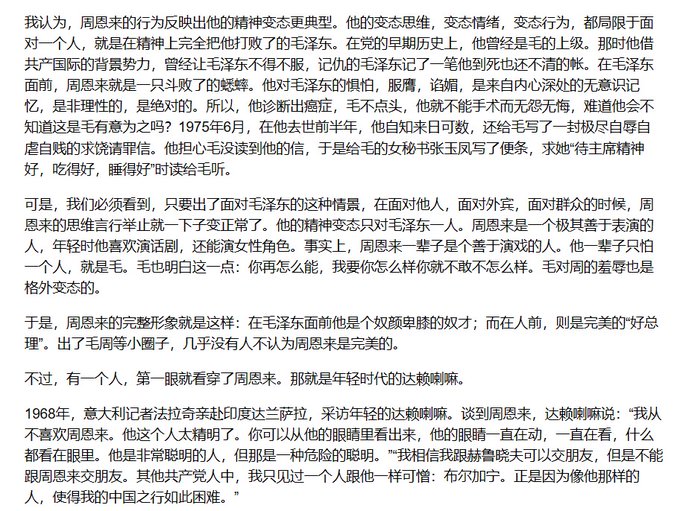 李江琳:周恩来的行为反映出他的精神变态更典型。他的变态思维,变态情绪,变态行为,都局限于面对一个人,就是在精神上完全把他打败了的毛泽东。在党的早期历史上,他曾经是毛的上级。那时他借共产国际的背景势力,曾经让毛不得不服,记仇的毛记了一笔他到死也还不清的帐