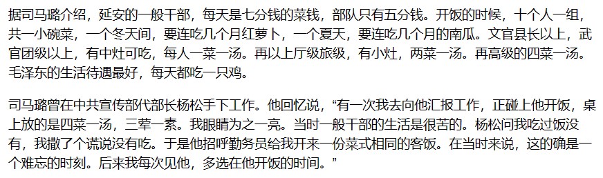 袁斌:延安的一般干部,每天是七分钱的菜钱,部队只有五分钱。十个人一组,共一小碗菜,一个冬天间,要连吃几个月红萝卜,一个夏天,要连吃几个月的南瓜。县长团级,有中灶可吃,每人一菜一汤。再以上厅级旅级,有小灶,两菜一汤。再高级的四菜一汤。毛泽东的生活待遇最好,每天都吃一只鸡