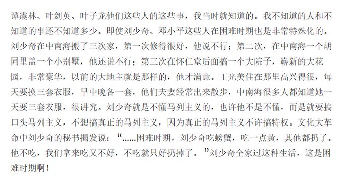 戚本禹:刘少奇、邓小平这些人在困难时期也是非常特殊化的。刘在中南海搬了三次家,第三次在怀仁堂后面搞一个大院子,崭新的大花园,非常豪华,王光美住在那里高兴的很,每天要换三套衣服,刘的秘书揭发说:“困难时期,刘吃螃蟹,吃一点黄,其他都扔了。他不吃,我们拿来吃又不好,不吃就只好扔”