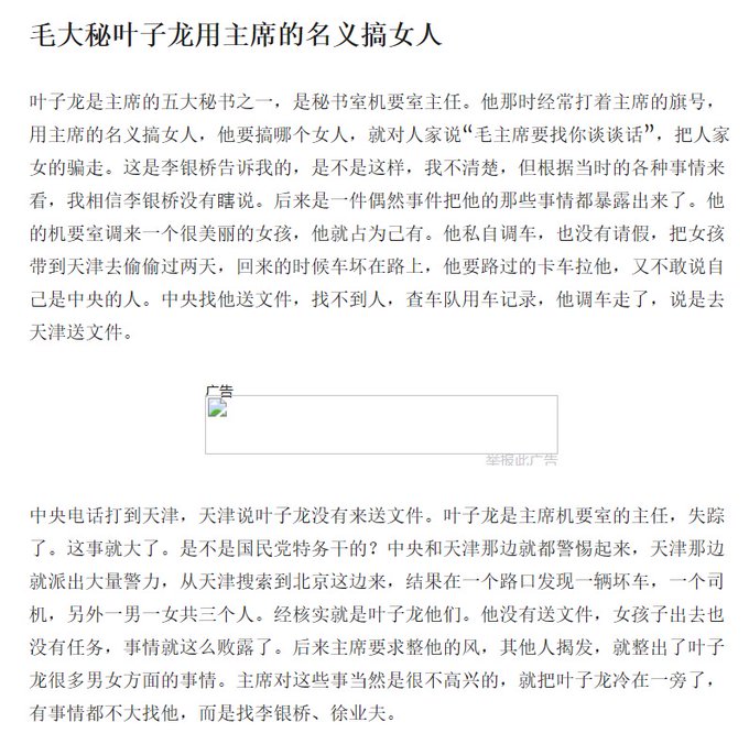 戚本禹:叶子龙是主席的五大秘书之一,是秘书室机要室主任。他那时经常打着主席的旗号,用主席的名义搞女人,他要搞哪个女人,就对人家说“毛主席要找你谈谈话”,把人家女的骗走。这是李银桥告诉我的,是不是这样,我不清楚,但根据当时的各种事情来看,我相信李银桥没有瞎说