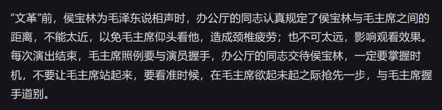 海上一浪花:侯宝林为毛泽东说相声时,办公厅的认真规定了侯宝林与毛之间的距离,不能太近,以免毛仰头看他,造成颈椎疲劳;也不可太远,影响观看效果。演出结束,毛照例要与演员握手,办公厅同志交待侯宝林,一定要掌握时机,不要让毛站起来,要看准时候,在毛欲起未起之际抢先一步,与毛握手道别