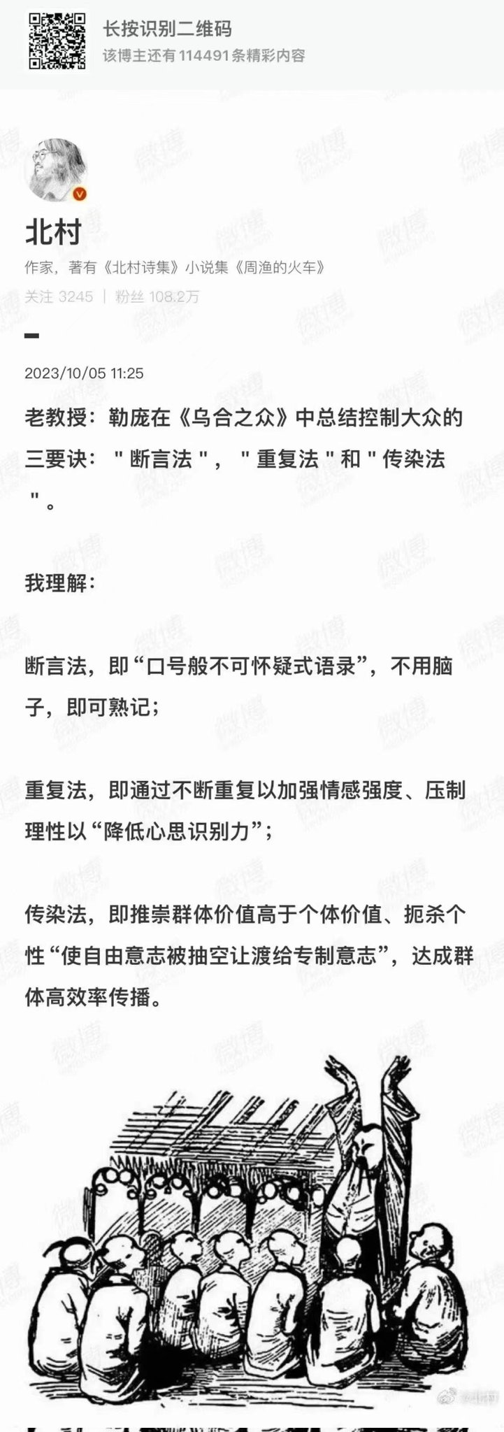 今日酷评【勒庞在《乌合之众》中总结控制大众的三要诀】断言法,即“口号般不可怀疑式语录”,不用脑子,即可熟记;重复法,即通过不断重复以加强情感强度、压制理性以“降低心智识别力”;传染法,即推崇群体价值高于个体价值、扼杀个性“使自由意志被抽空让渡给专制意志”,达成群体高效率传播。
