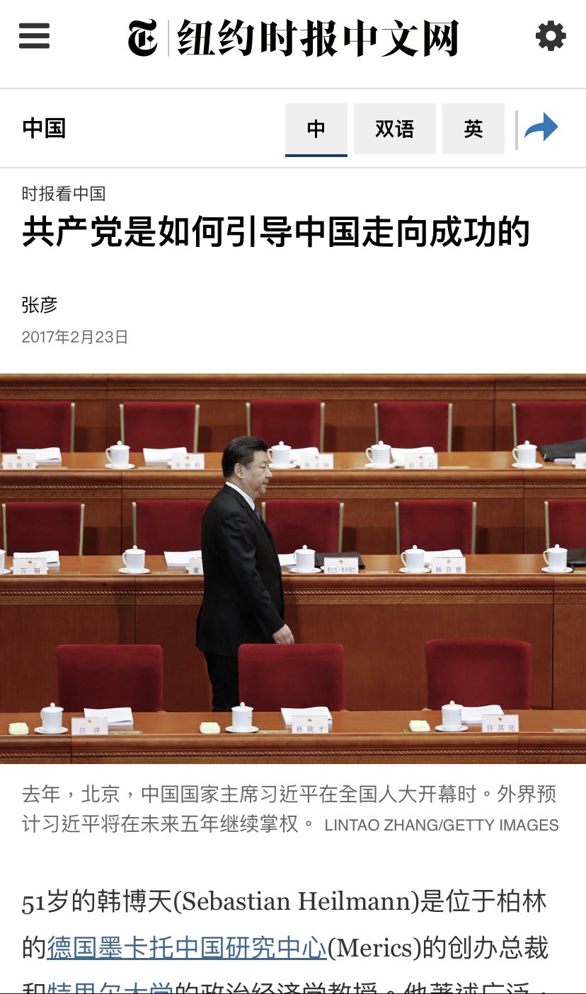 上海企业家胡力任也发纽约时报报道截图,报道标题是《共产党是如何引导中国走向成功的》并评论说,看看《纽约时报》是啥烂货色!