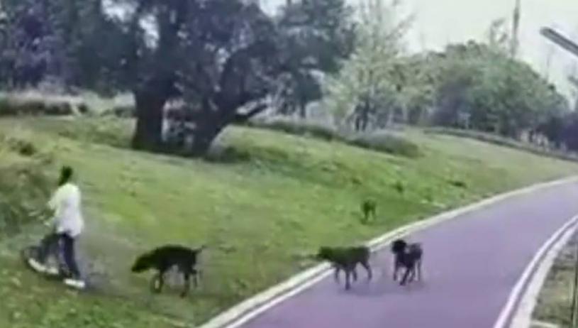 闭路电视画面显示,11月17日上午10时28分许,在公园人行道上,一名中年女子及一名小女孩被四只大狗尾随,当她们躲到绿化带后,四只大狗先后冲上围攻撕咬。为保护小女孩,女子将其压在身下。两人被撕咬1分钟多后,一名骑电动车的男子赶来制止,将四只大狗驱赶,男子没有被狗只攻击。