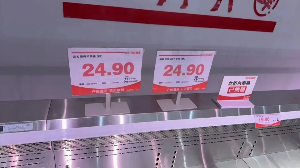 晚上九点多,王悦怡男友排了半小时才进去,感觉热闹程度堪比过年买年货,购物车没了,7.99元一斤的猪后尖肉、24.9元一斤的带骨羊前腿和羊排已售罄,冰柜堆着折叠起来的空纸箱。最后,他拎了些纸巾、烤肠、水饺和牛胸肉切片,9件商品消费235.19元。