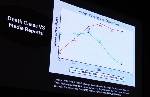 她说,一项针对多家国际大媒体的研究发现,“随着法轮功学员遭迫害死亡人数的增长,国际媒体报导法轮功遭酷刑迫害的报导数量却不断减少,最后基本上被消声。”这项研究涉及的七份报纸分别是:《伦敦卫报》、《澳大利亚人报》、《纽约时报》、《华盛顿邮报》、《华尔街日报》、《洛杉矶时报》、《今日美国》,此外,还包括新闻通讯社、美联社、法新社以及路透社