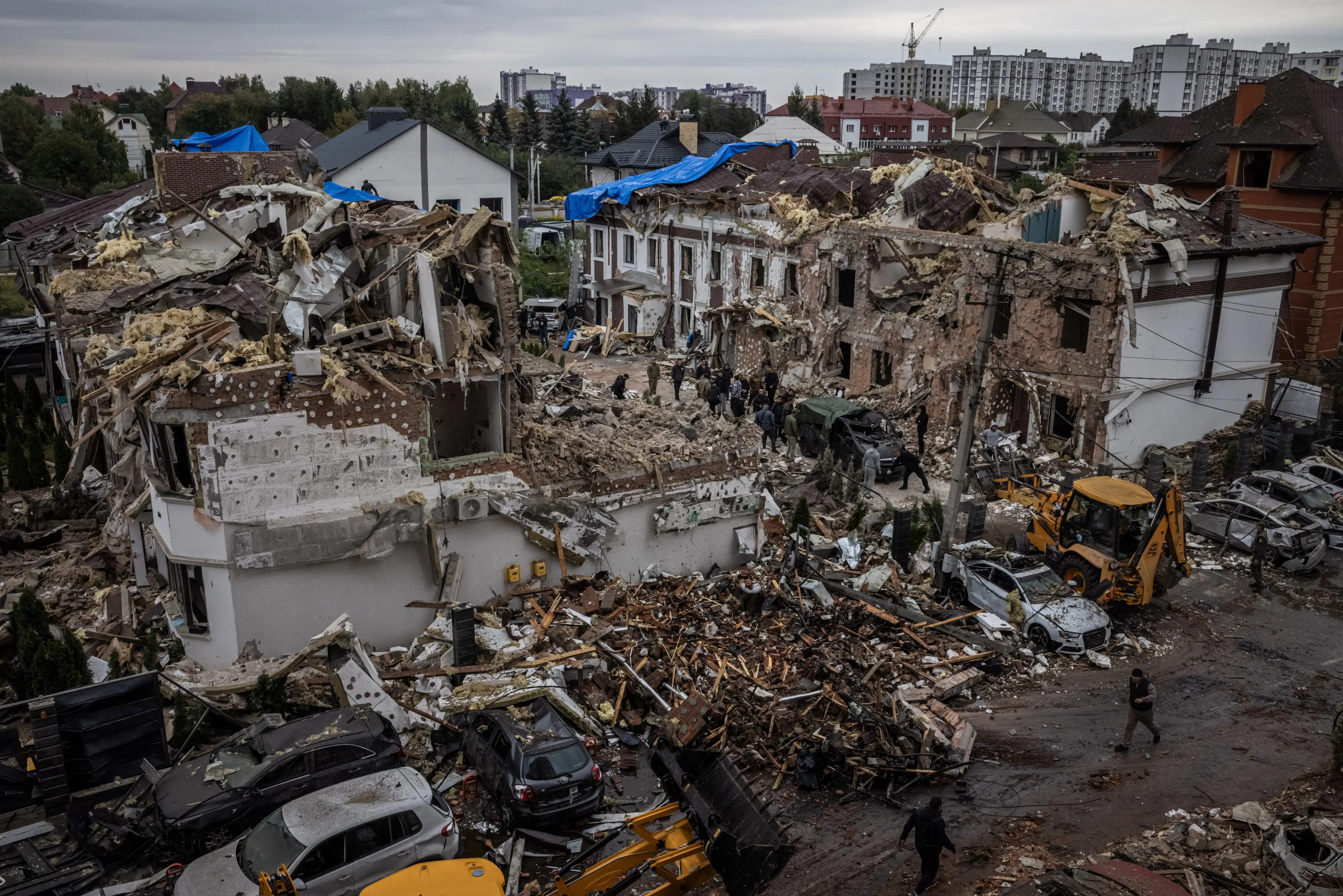 图为2025年9月28日,俄军于夜间至清晨再次对乌克兰基辅等地发动大规模无人机与导弹攻击,并造成严重破坏。(Ed Ram/Getty Images)