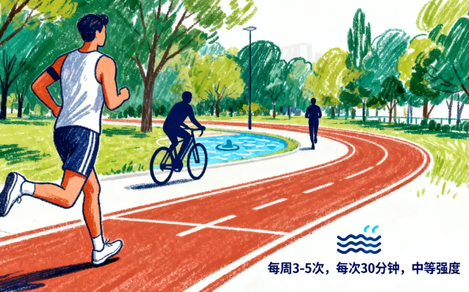 主打中等强度有氧运动,每周3-5次:选择快走、慢跑、游泳、打太极拳等运动,每周练3-5次,每次30分钟以上。怎么判断“中等强度”?运动时感觉身体微微出汗,心跳比平时快,但能正常说话(不能唱歌),比如50岁的人,运动后心率大概在96-128次/分钟(公式:(220-年龄)×60%-80%)。