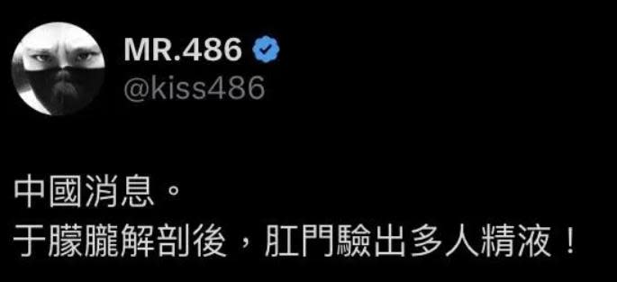 中国男星于朦胧上月坠楼身亡,死因成谜,网络疯传“虐杀抛窗”、“潜规则”、“剖肚取USB”等各种阴谋论,还流出疑似受虐的音档、影片。电商企业家486先生日前在个人社群爆猛料,称“于朦胧解剖后,肛门验出多人精液”,引发热议。对此,差点和于朦胧同公司的台湾女星胡文英上节目受访证实,更惊吐中国娱乐圈秘辛。