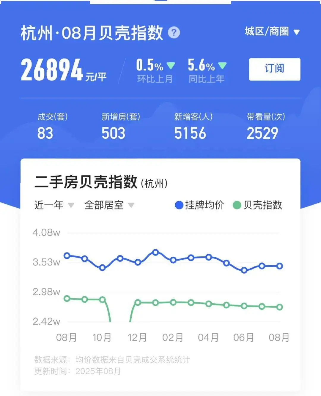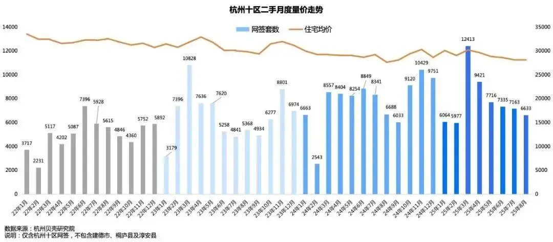 8月份,杭州市区(含富阳、临安)共成交二手房6633套,环比7月下滑7.4%;同比去年8月基本一致,微降0.88%。