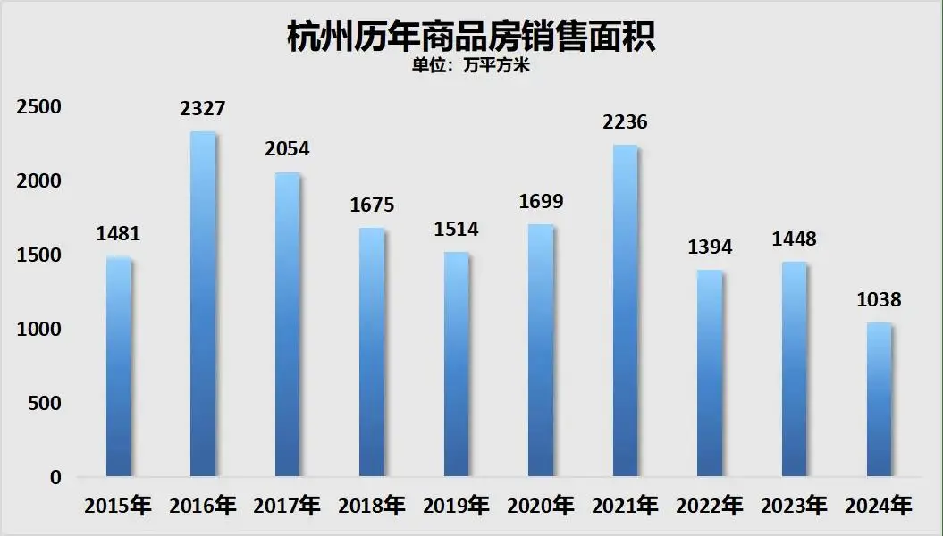 杭州楼市最高点在2016年,当年卖出了2327万平方米的商品房,之后一路下调,2021年再迎小高潮,卖出了2236万平方米。