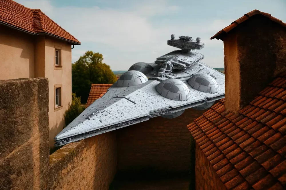 比如在这个版本中,《星球大战》的帝国战舰降落在尼埃普斯的家中,整个画面瞬间穿越成了科幻片。